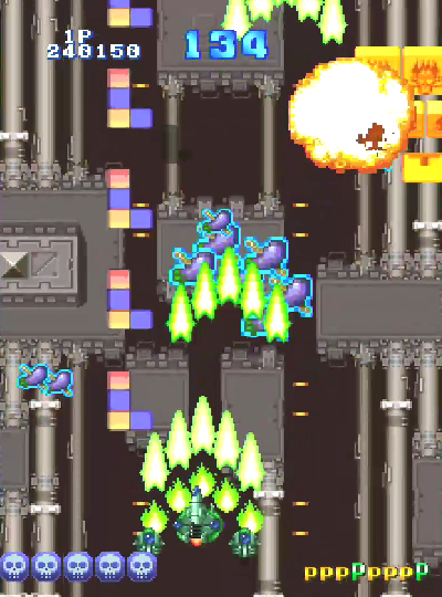 A very useful weapon which pierces through weaker enemies and locks onto stronger ones, doing them constant damage. This can be powered up to fire 5 thunder lasers and is quite the spectacle! Probably the weapon most people picture when they think of Truxton/TATSUJIN, and rightly so; it looks great!